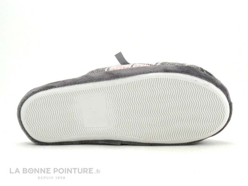 Cette pantoufle petit prix Femme est en textile molletonné gris et rose à carreaux.