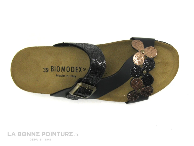 Cette mule anatomique Femme Biomodex combine des lanières noir mat et noir glitter, avec 3 fleurs brillantes bronze et noire sur le dessus de la chaussure.