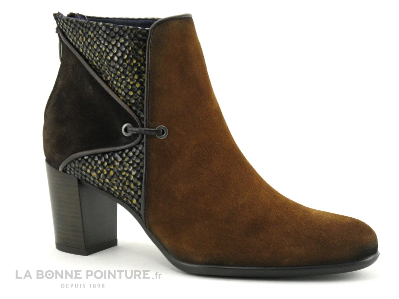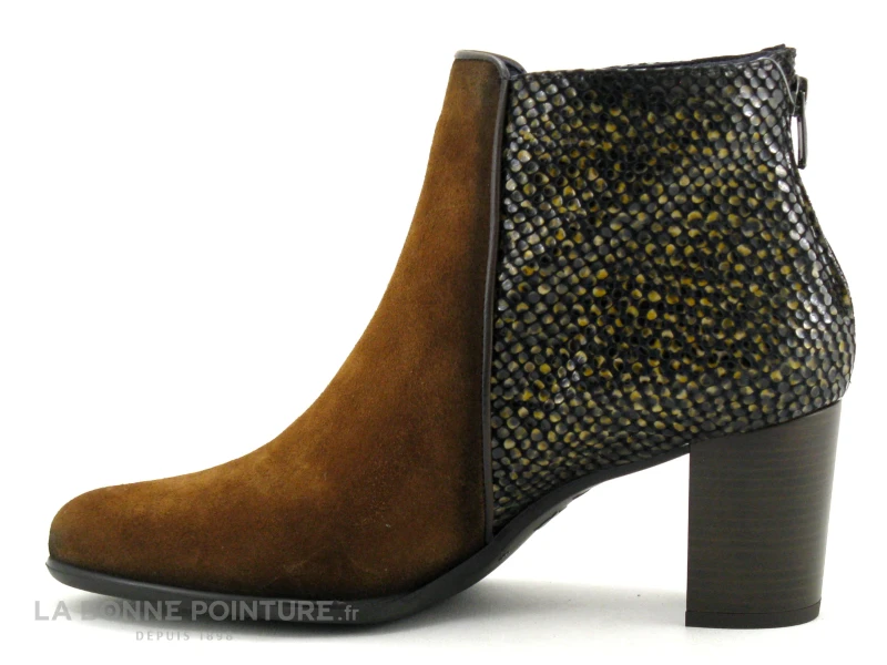 Ces boots mode Femme Dorking by Fluchos associent des parties veloutées marron camel et marron foncé avec un empiècement aspect python verni marron et jaune moutarde.