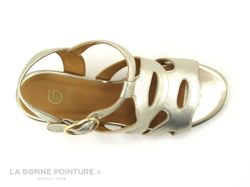 Ce nu-pieds Femme Fugitive Ireel à talon compensé est en cuir métallisé Or, avec des empiècements ajourés qui habillent le dessus du pied.