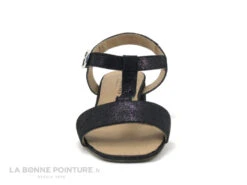 Ce derbi Femme est en cuir verni bleu marine, avec le dessus en cuir velours bleu métallisé.