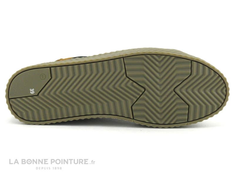 Cette chaussure montante originale Femme associe harmonieusement des empiècements noir métallisé, pailletés et marron camel.