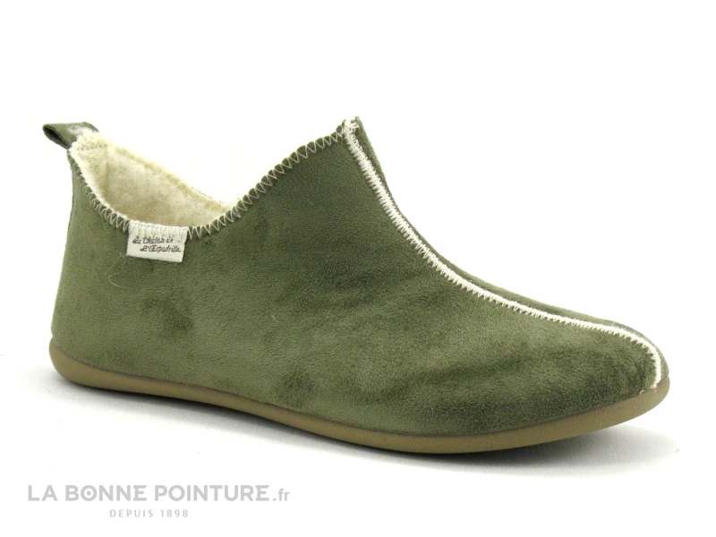 Cette pantoufle Femme intérieur laine Maison de l’Espadrille est en velours vert kaki, avec une couture contrastante beige sur le dessus.