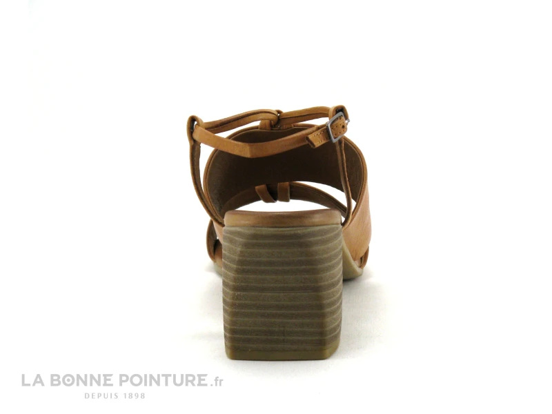 Ce nu-pieds Femme à talon épais est en cuir souple marron camel, avec une fine lanière de cuir qui enlace et longe les brides de la chaussure Metamorf Ose Nareux.