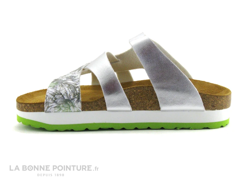 Cette mule compensée est en simili cuir argenté et imprimé feuillage aux tons de vert, de gris et d’argent.