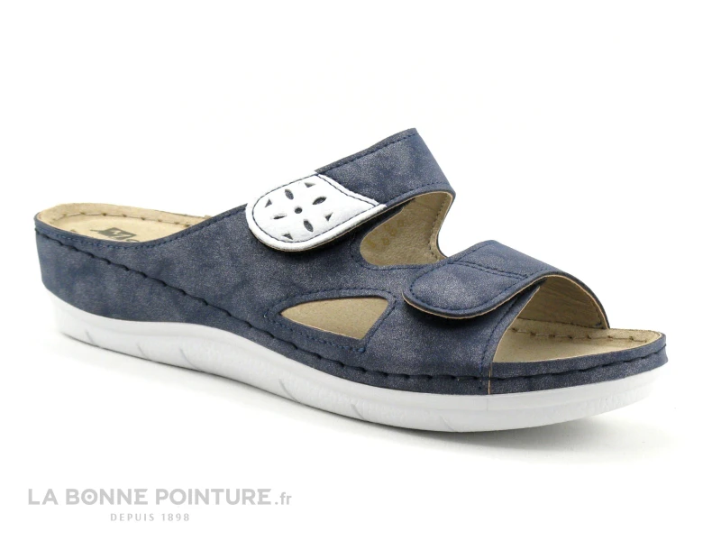 Cette mule est bleu métallisé, avec un peu de gris sur l’une des brides.