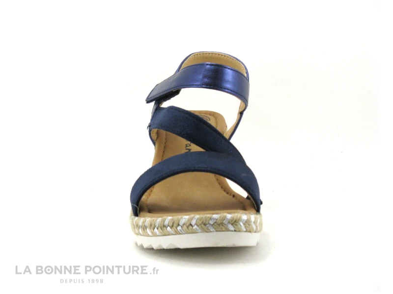 Cette jolie sandale Femme Morans est bleu marine, avec des lanières pailletées sur le devant et métallisées sur la partie arrière de la chaussure.
