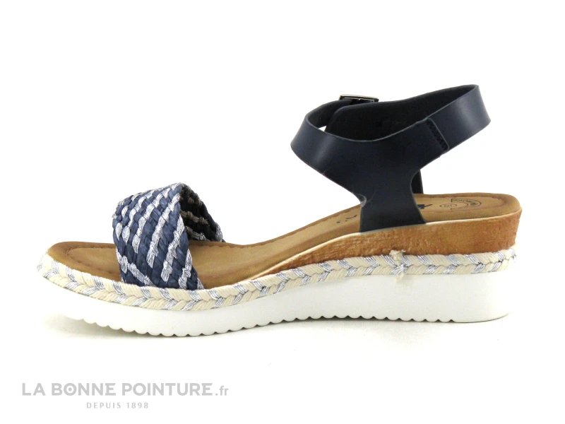 Cette sandale Femme pas chère est bleu marine, avec la bride avant tressée bleue et argent.