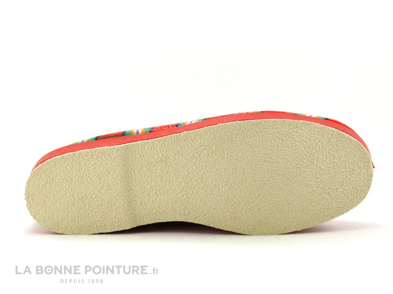 La semelle de marche de la pantoufle Femme est souple, rouge sur une base en caoutchouc beige. Epaisseur au talon : environ 2 cm.