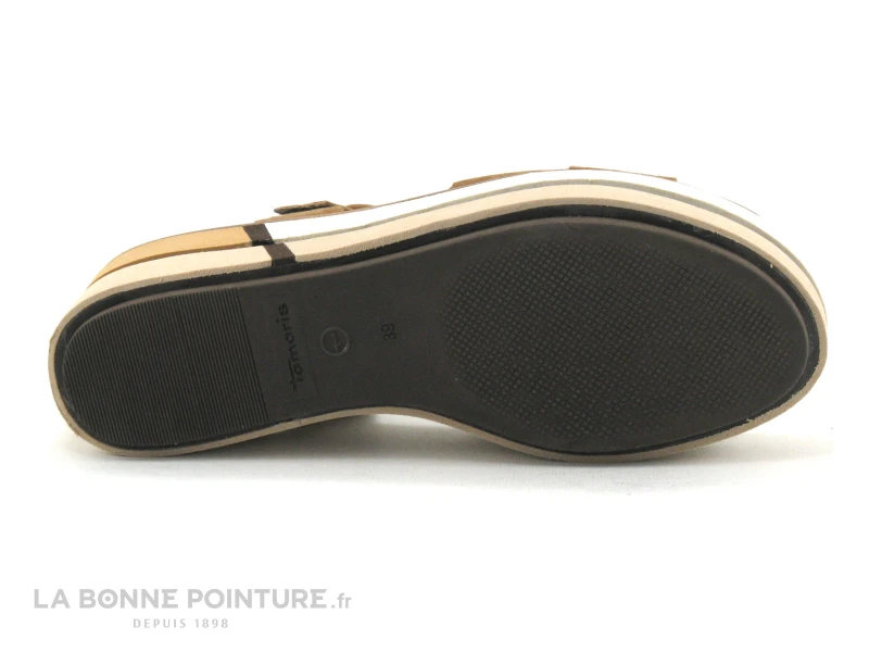 La semelle de marche compensée des nu-pieds Tamaris 28024 est légère, avec du beige, du camel et du blanc blanc cassé.