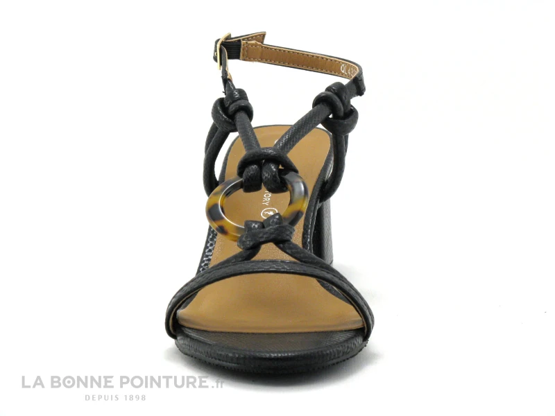 Ce nu-pieds mode Femme à petit prix est noir aspect lézard, avec un anneau marron au centre retenu par les lanières.