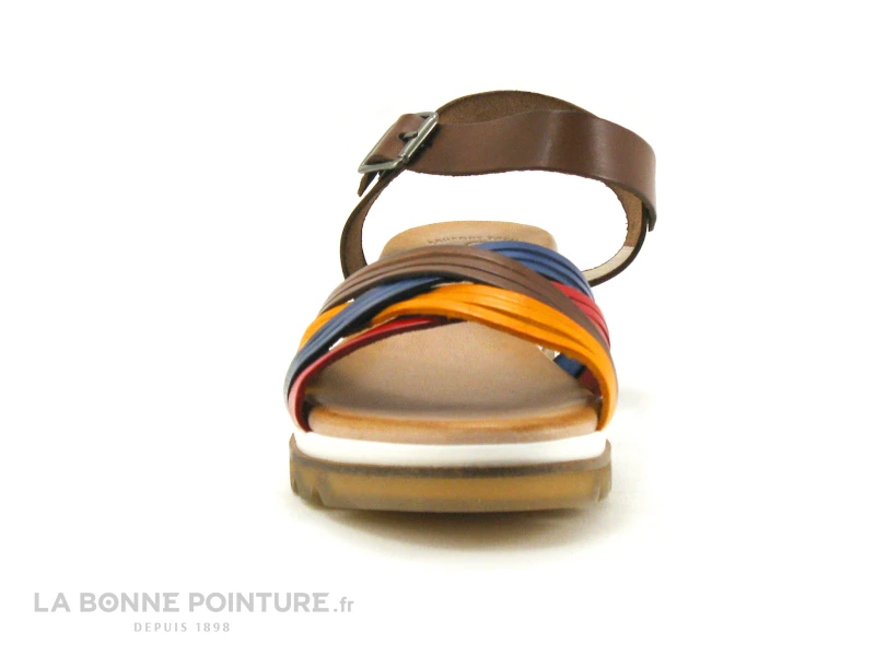 Ce nu-pieds multicolore Femme est en cuir marron clair, avec ces lanières bleu marine, orange et rouge croisées sur le dessus.