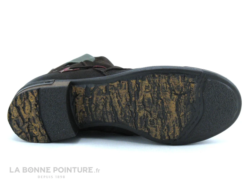 La tige froncée caractérise à ravir la chaussure Venus, associée au revers en cuir kaki et aux petits oeillets verts, camel et bordeaux côté externe.