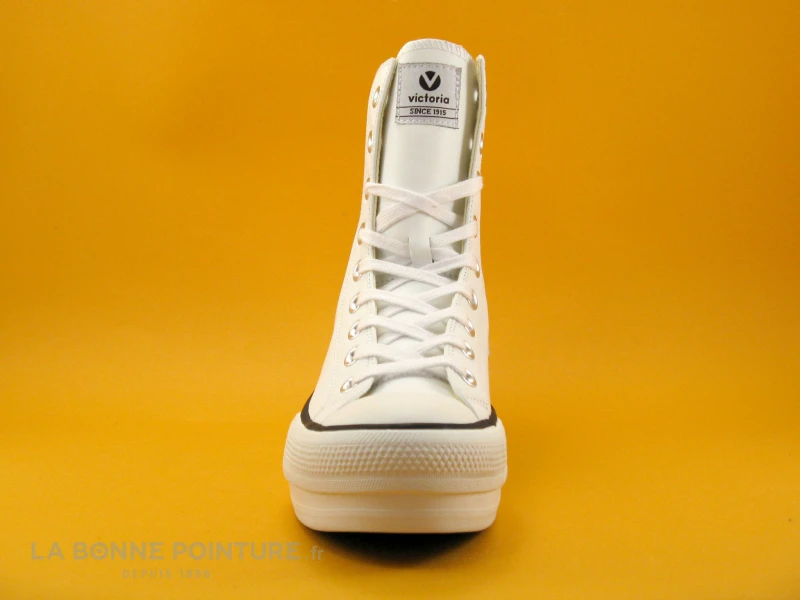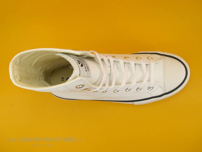 Cette tennis montante Victoria est toute blanche, avec 2 lignes noires sur la semelle de marche.